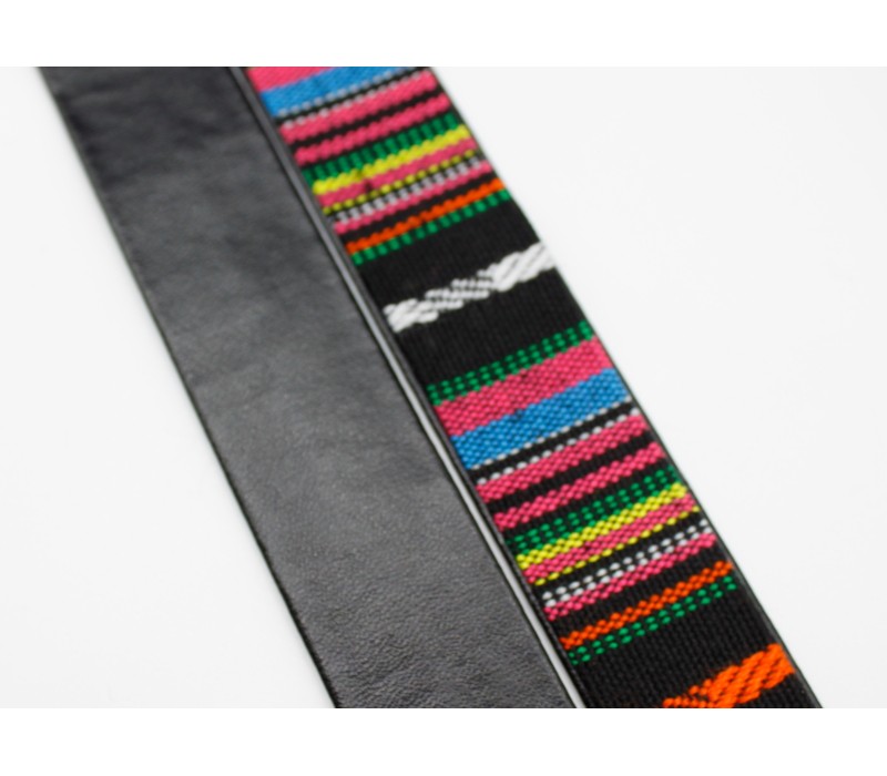 The Webbing has a woven colourful design on the front and a fake leather backing.